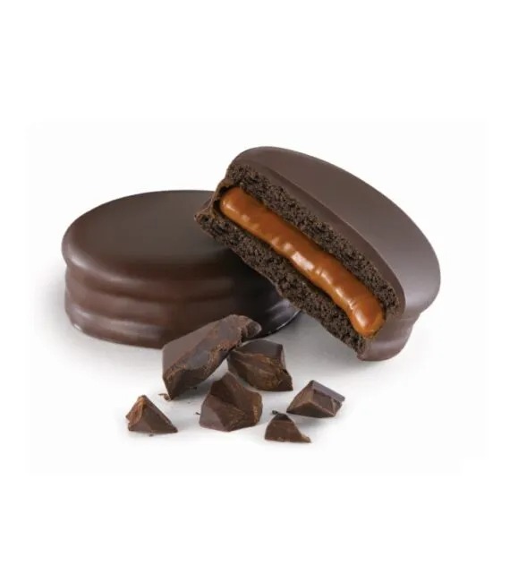 Alfajores rellenos con dulce de leche con cobertura de chocolate 70% Cacao Puro. Caja x 4 unidades.